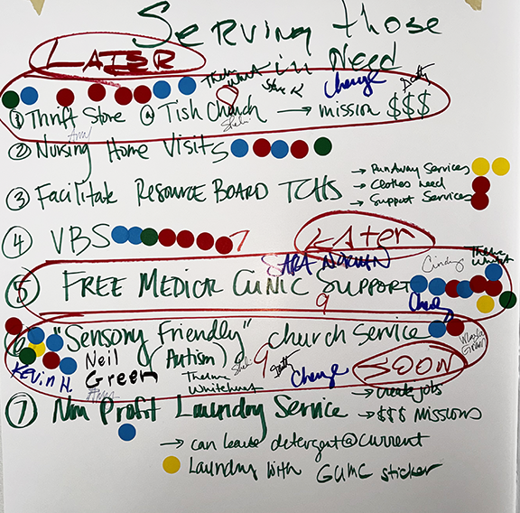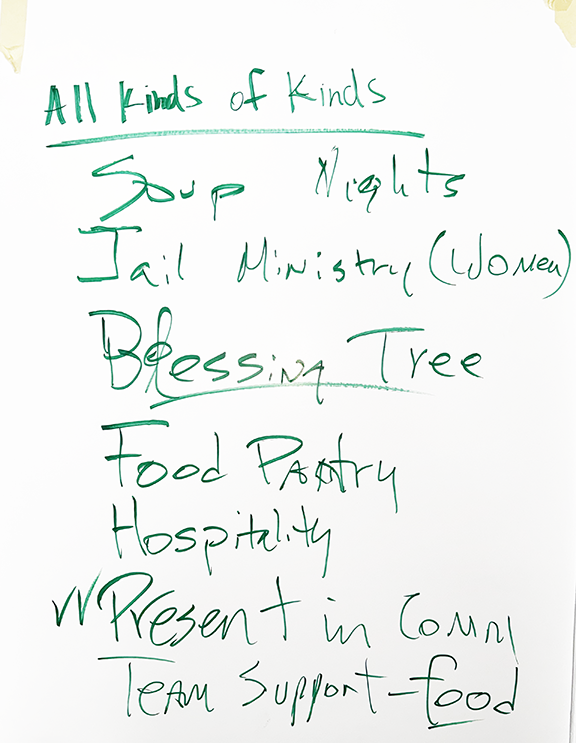 The conversation then turned outward. What is already happening through Grace UMC, and what does our community need that is not being met? The list of ministries already in motion is long and meaningful. Grace UMC serves as a church for all kinds of kinds. It hosts Soup Sunday and Jail