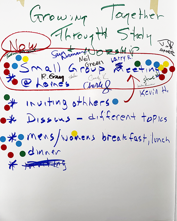 for more young people. Others spoke about the challenge of keeping in touch with graduates when they leave for college. Space was mentioned, both in terms of physical room and in how crowded the calendar can feel. Financial limitations came up, along with the fatigue that comes from trying to do everything with a small group of faithful volunteers. A few people also named something that many churches experience, that opinions can clash and that disagreement sometimes makes it hard to move forward together.